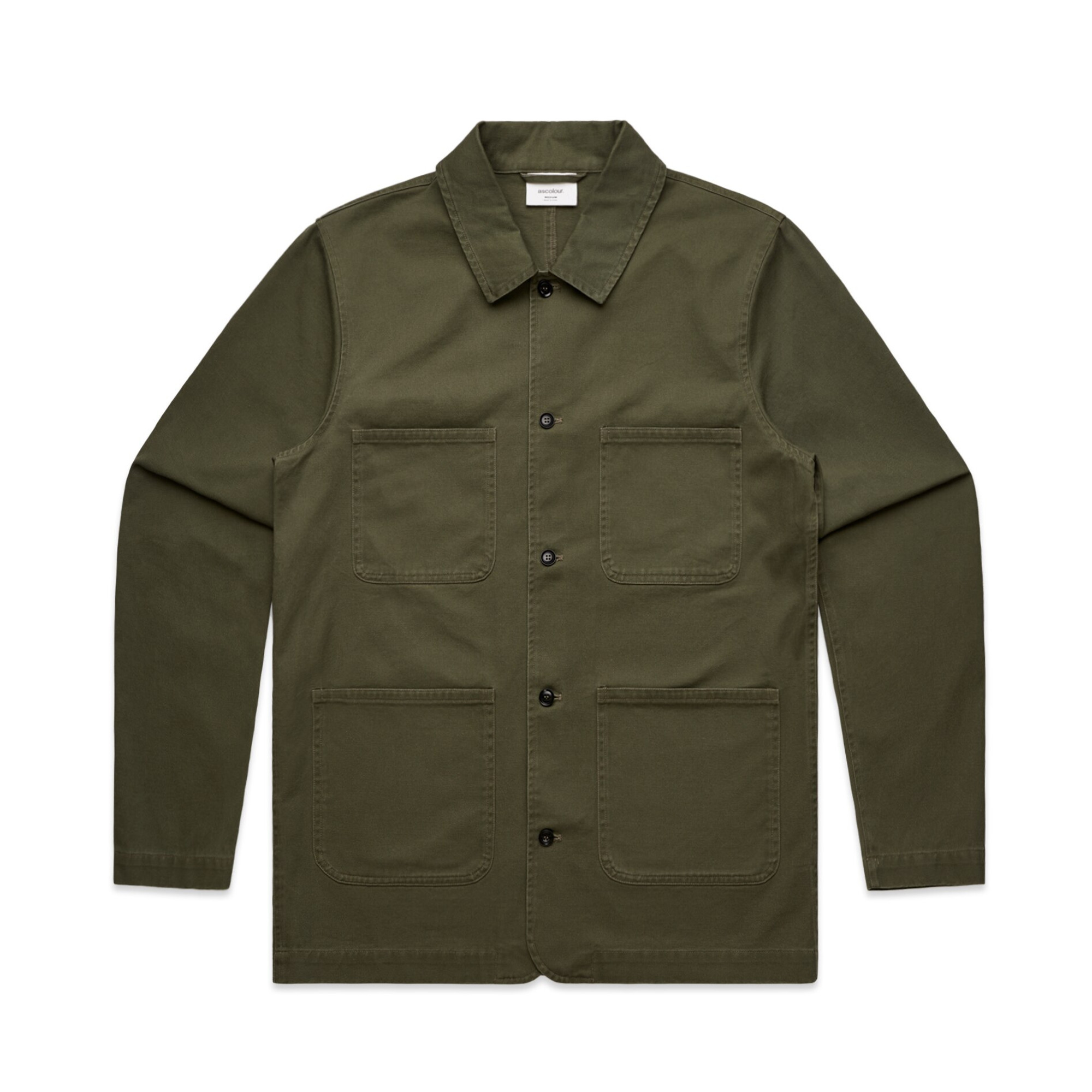 Four pocket collared shirt jacket, unlined, corozo buttons to close