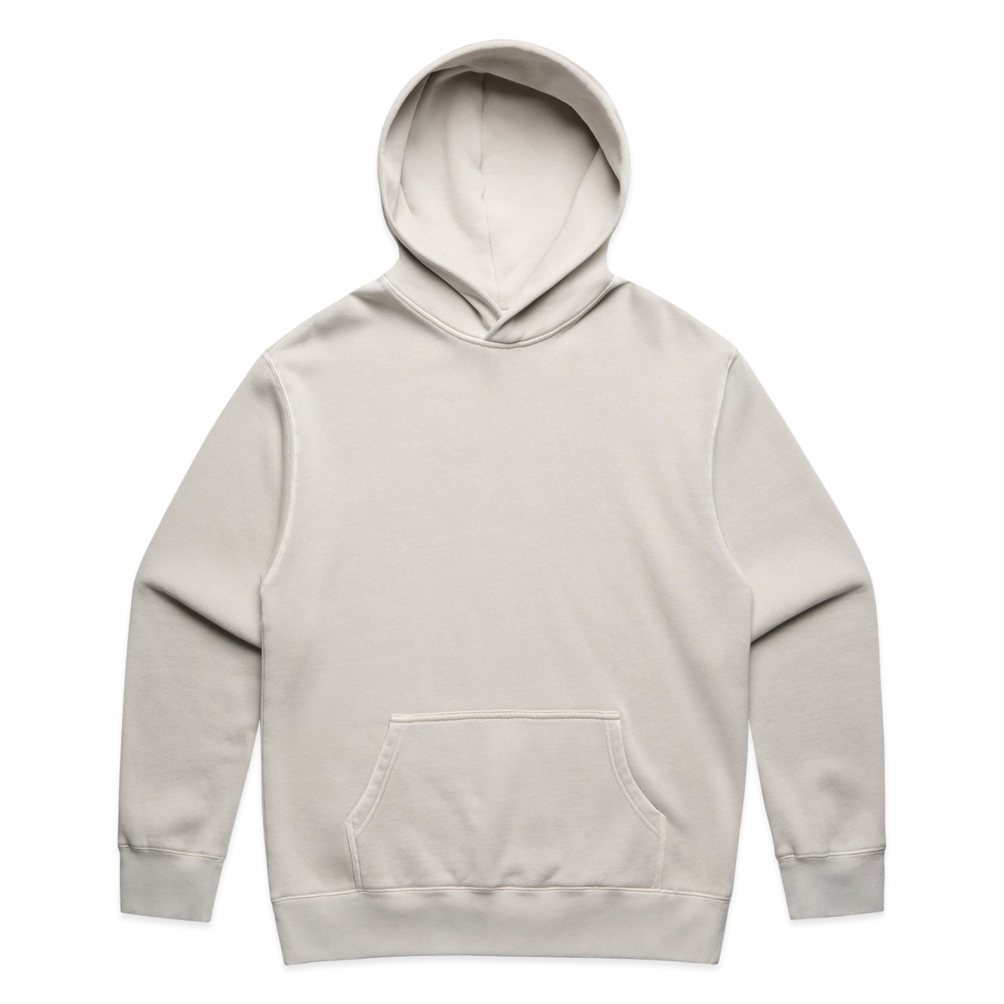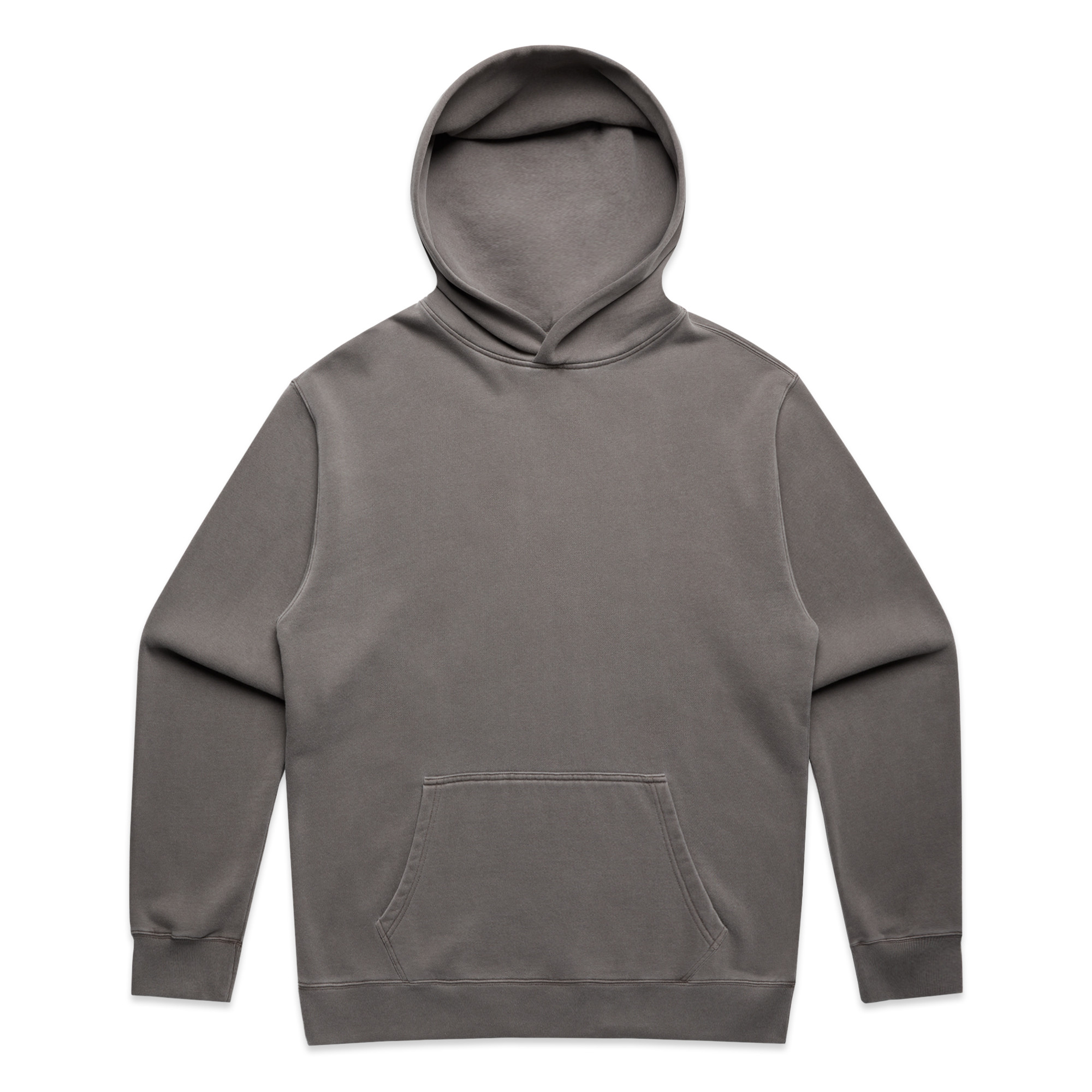 Pullover hood, drop shoulder, kangaroo pocket, self-fabric lined hood, no drawcord, garment dyed, sleeve cuff ribbing