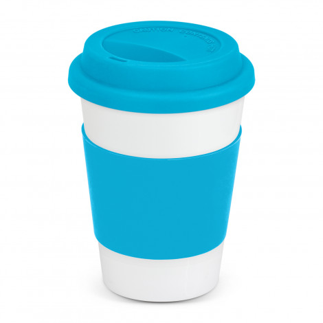 Robust 350ml ceramic coffee cup with a large heat-resistant silicone band and a secure push on silicone lid. The band and lid can be mixed and matched in any colour combination from the standard colours at no extra cost. Up to five different colour combinations are included in the price and more are available for an additional charge. Aztec is presented in a natural gift box. This product is not dishwasher safe and handwashing is recommended.
