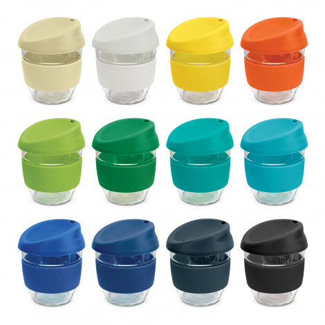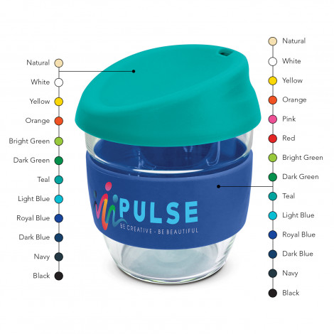 Elegant 250ml reusable borosilicate glass coffee cup with a secure push on silicone lid and a wide heat-resistant silicone band. Borosilicate is lightweight, exceptionally strong and shatter-resistant. It is a BPA-free choice for a clean, pure taste and is a natural alternative to single-use paper cups. The lid and band can be mixed and matched in any colour combination from the standard colours at no extra cost. Up to five different colour combinations are included in the price and more are available for an additional charge. Nova Cup is presented in an unbleached cardboard gift box with a window to show the branding and product care instructions are printed on one side. An optional gift tube is available on request. This product is not dishwasher safe and handwashing is recommended. Nova Cup is protected under New Zealand Design Registration No. 426637 and Australian Design Registration No. 201916426.