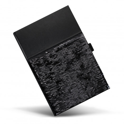 Luxury hard cover notebook with a tactile panel of reversible sequins which alternate between black and silver depending on which way they are brushed. The notebook has 80 leaves (160 pages) of 70gsm lined cream paper and features a black elastic pen loop.